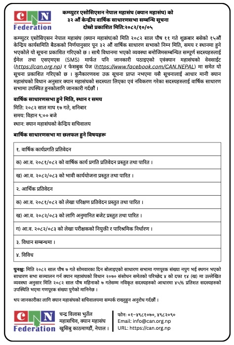 कम्प्युटर एसोसिएशन नेपाल महासंघ (क्यान महासंघ) को ३२ औं वार्षिक साधारणसभा सम्बन्धि सूचना ! कम्प्युटर एसोसिएशन नेपाल महासंघ (क्यान महासंघ) को ३२ औं वार्षिक साधारणसभा सम्बन्धि सूचना दोस्रो प्रकाशित मिति:२०८२/१०/०५ .... |
